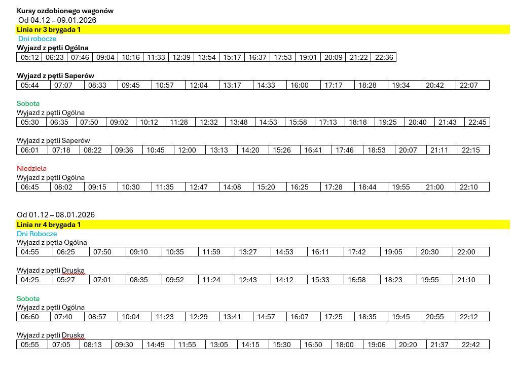Już dzisiaj na ulice wyjadą nasze specjalne świąteczne wagony! Poniżej harmonogram ich kursowania: